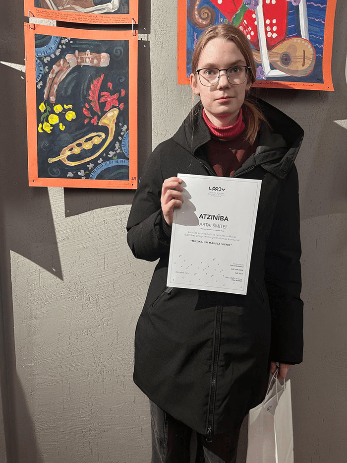 6. martā mūsu skolas audzēkņi devās ekskursijā uz Liepāju, bet virsuzdevums šim braucienam bija uzticēts Karlīnai Kronei un Artai Šmitei. Meitenes piedalījās Liepājas Mūzikas, mākslas uz dizaina vidusskolas rīkotajā konkursā “Mūzika un māksla vieno”. Arta par savu darbu sīvā Latvijas profesionālās ievirzes mākslas skolu konkurencē saņēma atzinību. Savukārt Artas skolotājs Uldis Pauzers pateicību par audzēkņa sagatavošanu.